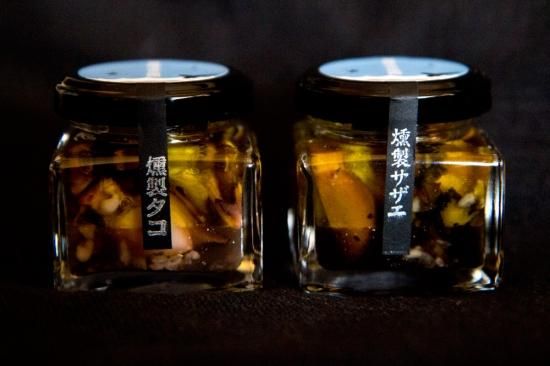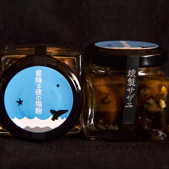 原材料: 魚介類(それぞれサザエ/タコ)オリーブ油、塩麴(米麹・塩)、にんにく、香辛料