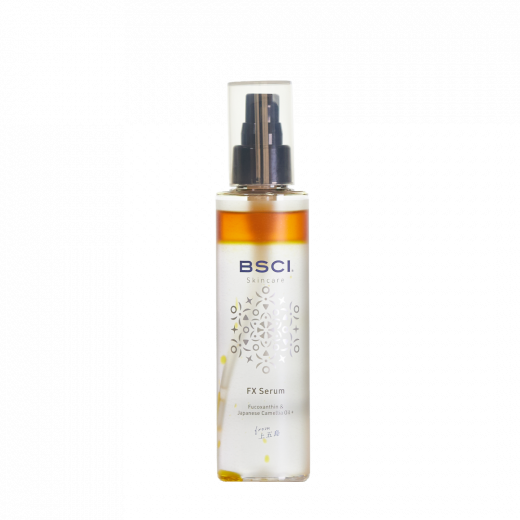 BSCI FXセラム(美容化粧水)は、化粧水、美容液、乳液の3つの機能を1つに凝縮した2層式のセラム。上層は貴重なフコキサンチンを、肌なじみがよく保湿に優れた五島産椿油に配合しました。下層は肌を引き締め整えるハマメリス水を主としています。